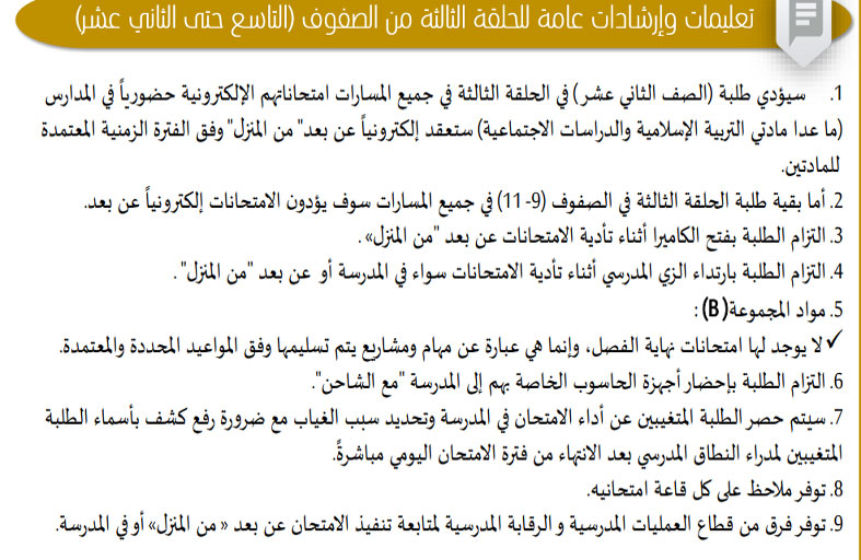 وقالت ضمن تعليماتها العامة، إنه سيتم إجراء الامتحانات إلكترونياً على منصة "Swift Assess"، وينبغي التأكيد على الطلبة بضرورة الالتزام فتح الكاميرا أثناء تأدية الامتحانات عن بعد " من المنزل "،و التأكيد عليهم بضرورة الالتزام بارتداء الزي المدرسي أثناء تأدية الامتحانات "من المنزل".