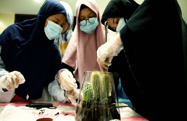 الجدير أن الورشة مزجت الجوانب الفنية بالجوانب البيئية من خلال الحفاظ على النباتات وإكثارها والمحافظة عليها ووضعها في قوالب الزينة المنزلية من خلال الشرح النظري والتطبيق العملي والذي قدمته المهندسة الزراعية آية برهم لتكسب الطالبات مهارة عمل الحدائق الزجاجية بشكل جميل وجاذب ويراعي نوعية النباتات المختلفة .