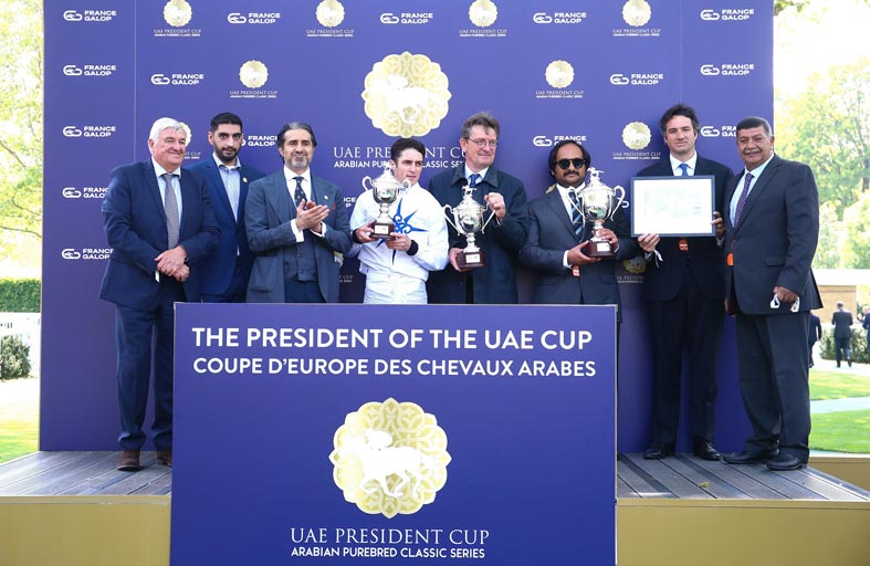ويبلغ مجموع جوائز السباق 650 ألف يورو ويقام برعاية كأس رئيس الدولة للخيول العربية الأصيلة. ونجح البطل من قطع مسافة السباق بزمن 1:38:56 دقيقة، وحل بالمرتبة الثانية إسحاق شيلبي جي بي ( نايث اوف ثندر x كنتاكي ) ، فيما جاء بالمركز الثالث بريز سكاي ( بيدرو ذا جريت x آنا دانسي). كما نجحت المهرة "بلو روز سن" ( تشرشيل x كوين بلوسوم) ملك يوغادا سنتوريون من حصد لقب الإمارات جينيز الفرنسي للمهرات للفئة الأولى الذي أقيم لمسافة 1600 متر في مضمار لونغ شامب ، بإشراف المدرب كريستوف هيد وقيادة الفارس أوريلين ليميتر وتبلغ مجموع جوائز الشوط 550 ألف يورو ، ويقام برعاية كأس رئيس الدولة للخيول العربية الأصيلة.