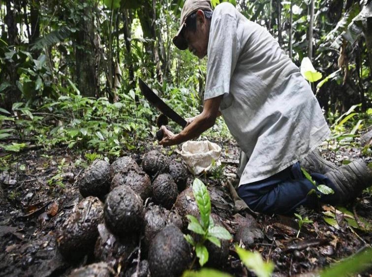 وباستخدام منجل، يفتح القشرة البنية السميكة لثمار الجوز الأمازوني "اسمه العلمي بيرتوليتسيا اكسيلسا"، وهي شجرة يصل ارتفاعها إلى 60 مترا وتعيش حتى ألف سنة.