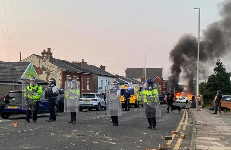 وقالت وزيرة الأمن ديانا جونسون لمحطة «بي بي سي نيوز» إن أعمال الشغب «لن يتم التسامح معها»، محذّرة من «عقوبات وعواقب» للفوضى. وتواصلت الاضطرابات في العديد من البلدات والمدن لليوم الرابع السبت بعد الهجوم بالسكين الاثنين في ساوثبورت قرب ليفربول على الساحل الشمالي الغربي لإنكلترا. وقد غذّتها شائعات كاذبة على وسائل التواصل الاجتماعي حول خلفية المشتبه به البريطاني المولد أكسل روداكوبانا البالغ 17 عاما، والمتهم بالقتل ومحاولة القتل بسبب الهجوم على مدرسة رقص. وروداكوبانا متهم بقتل بيبي كينغ (6 أعوام) وإلسي دوت ستانكومب (7 أعوام) وأليس داسيلفا أغويار (9 أعوام)، وإصابة 10 أشخاص آخرين.