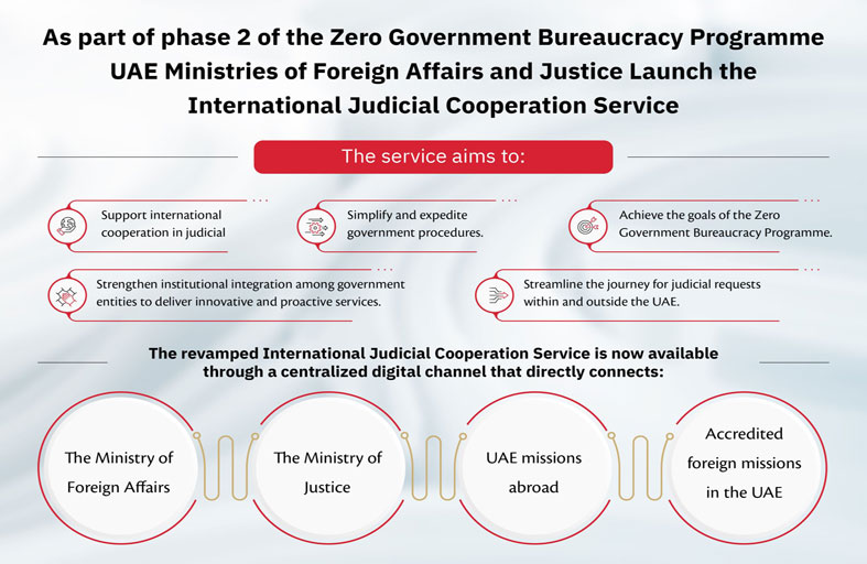 أطلقت وزارة الخارجية، بالشراكة مع وزارة العدل، خدمة التعاون القضائي الدولي، وذلك ضمن برنامج تصفير البيروقراطية الحكومية في مرحلته الثانية؛ وبهدف تحقيق قفزة نوعية في تقديم الخدمات الحكومية، وتطوير نظام متكامل يعزز من جودة التعاون الدولي في المسائل القضائية، من خلال منصة رقمية موحدة تربط بين وزارتي الخارجية والعدل والبعثات التمثيلية للدولة في الخارج، والبعثات الأجنبية المعتمدة لدى دولة الإمارات.وتقدم خدمة "التعاون القضائي الدولي" في تحديثها الجديد عبر قناة مركزية تربط الجهات القضائية والدبلوماسية من خلال ثلاث خطوات فقط، وتختصر زمن الإنجاز عبر أتمتة الإجراءات بما يُقلل من التأخير الناتج عن الإجراءات التقليدية، ويُسهم في توحيد مسار تبادل الطلبات المعنية داخل الدولة وخارجها.جدير بالذكر أن وزارتي الخارجية والعدل كانتا ضمن الجهات الفائزة بجائزة "تصفير البيروقراطية الحكومية" في دورتها الأولى؛ حيث فازت وزارة الخارجية بجائزة "الحلول المبتكرة" عن مشروع "البعثة الذكية"، الذي نجحت من خلاله في تصفير 80% من إجراءاتها البيروقراطية، فيما حصدت وزارة العدل المركز الأول في فئة أفضل فريق على مستوى حكومة الإمارات في تصفير البيروقراطية.