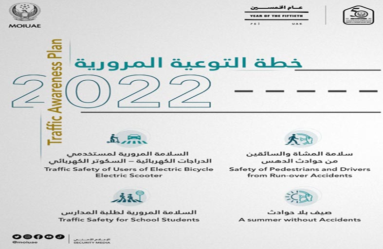 أطلقت وزارة الداخلية، ممثلة في مجلس المرور الاتحادي برنامج التوعية للحملات المرورية الموحدة على مستوى الدولة لعام 2022، وذلك ضمن مبادرات قطاع المرور لتحقيق الأهداف الإستراتيجية للوزارة في التقليل من الحوادث المرورية من خلال عمل تكاملي مشترك بالتنسيق مع جميع الجهات والمؤسسات المعنية بسلامة وأمن الطرق.