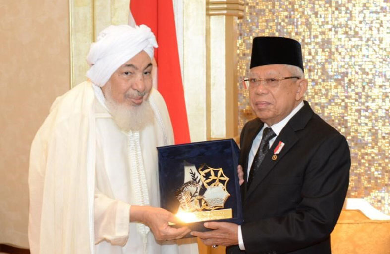 وسلم معالي الشيخ عبدالله بن بيّه رئيس منتدى أبوظبي للسلم الجائزة إلى معالي الدكتور معروف أمين نائب رئيس جمهورية إندونيسيا نيابة عن فخامة رئيس إندونيسيا وذلك خلال استقباله أمس الأول في قصر الامارات في أبوظبي.