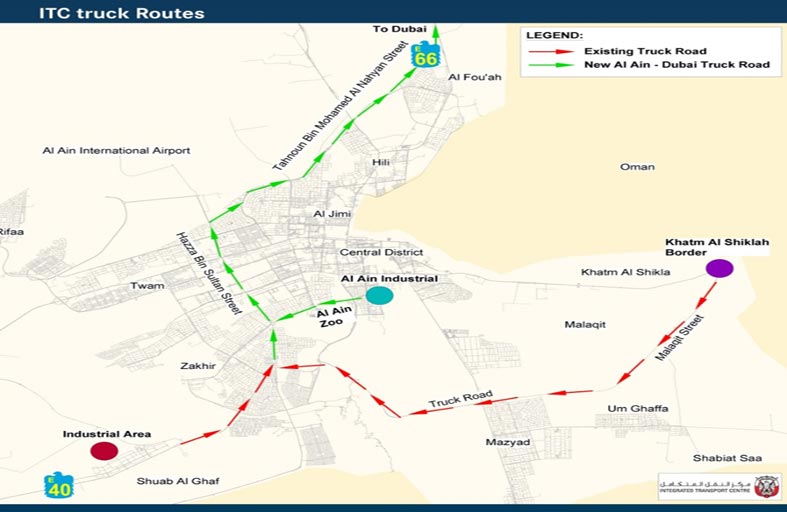 أعلن مركز النقل المتكامل وبالتعاون مع بلدية مدينة العين والقيادة العامة لشرطة أبوظبي أنه سمح اعتبارا من أمس بتنقل الشاحنات من وإلى إمارة دبي باستخدام طريق طحنون بن محمد آل نهيان /العين - دبي/ E66/ مرورا بشارع هزاع بن سلطان في مدينة العين، خارج أوقات الذروة من الساعة 10:00 مساء وحتى الساعة 6:00 صباحا، على أن لا يتجاوز الحد الأقصى الكلي لوزن الشاحنة المسموح به 45 طنا.
