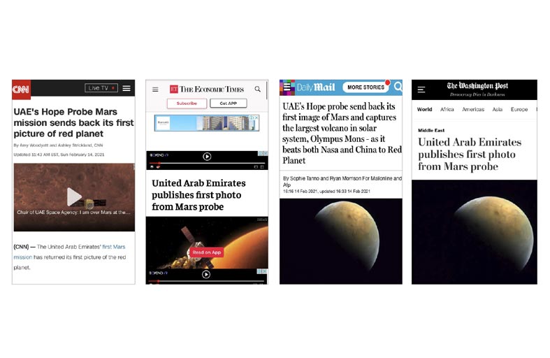 وتناول موقع "ذا إكونوميك تايمز" الهندي الشهير المتخصص في عالم الأعمال والاقتصاد خبر قيام دولة الإمارات بنشر أول صورة من مسبار الأمل الذي يدور الآن حول الكوكب الأحمر. وأفاد الموقع بأن الصورة تظهر ضوء الشمس قادماً نحو سطح المريخ، كما تظهر القطب الشمالي للمريخ، بالإضافة إلى أكبر بركان على الكوكب، المسمى أوليمبوس مونس، مضيفاً أن المسبار دخل مداره حول المريخ يوم الثلاثاء الماضي ما يعد نجاحاً لأول مهمة بين الكواكب في العالم العربي.