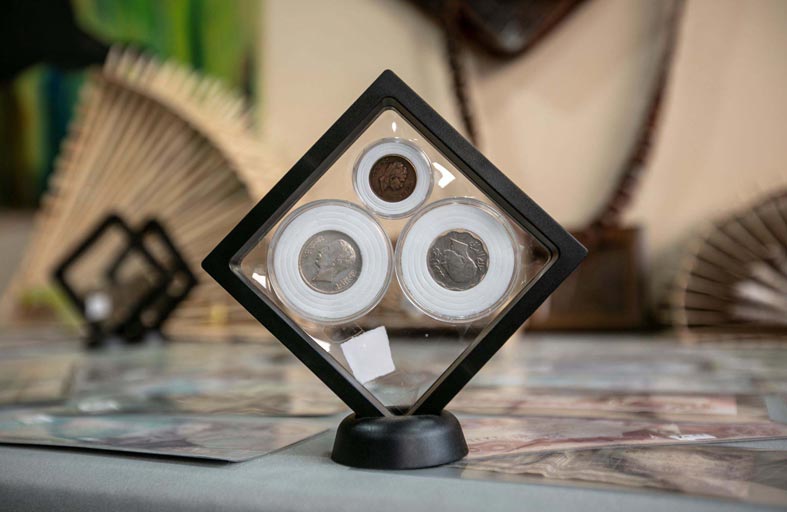 وعلى إحدى منصات الجناح تظهر مجموعة من العملات النقدية لكل منها تاريخ وتصميم ولون، ومن بينها تبرز إحدى العملات الفلبينية التي يعود إصدارها إلى سنة 935، الأمر الذي جعلها الأقدم في المجموعة الفريدة التي تعرضها الرسامة العراقية مريهان حسين الوائلي التي تعشق العملات واتخذت منها هواية خاصة.
