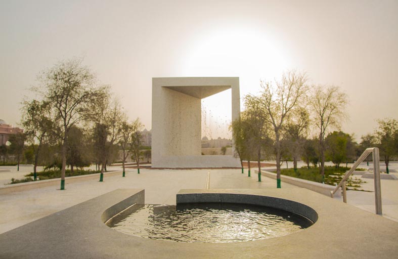 ويرمز وجود "الفلج" في الصرح إلى جانب الحديقة التراثية، إلى شغف الوالد المؤسس بالطبيعة ودوره في حماية المصادر الطبيعية لدولة الإمارات، من خلال تطبيق رؤيته وسياساته الاستشرافية الحكيمة، حيث وضع الخطط والمشاريع لحمايتها واستدامتها، وغرس تلك المفاهيم في نفوس الأجيال من أبناء الوطن، وظهر جليًا في جهوده البارزة في مشروع " تخضير الصحراء"، الهادف لجعل الصحراء منطقة قابلة للعيش، حيث اتسعت الرقعة الزراعية خلال فترة حياته، وزرعت ملايين الأشجار وسط الصحراء، وأنقذت الأنواع المهددة بالانقراض منها، وهي جهود ومنجزات تحكي إرادة قائد وبصيرة حكيم، اهتم بتأمين أفضل طرق التطوير الزراعي، مواجهًا قسوة البيئة الصحراوية، كما دلت أدواره الرائدة في تحقيق استدامة الموارد الطبيعية، على فكر ثاقب، ساهم في جعل الإمارات نموذجًا عالميًا فريدًا يُحتذى في حماية الموارد الطبيعية للبيئة واستدامتها، وضمن أهم دول العالم وأكثرها تأثيرًا في التصدي للتحديات البيئية التي تواجه العالم.