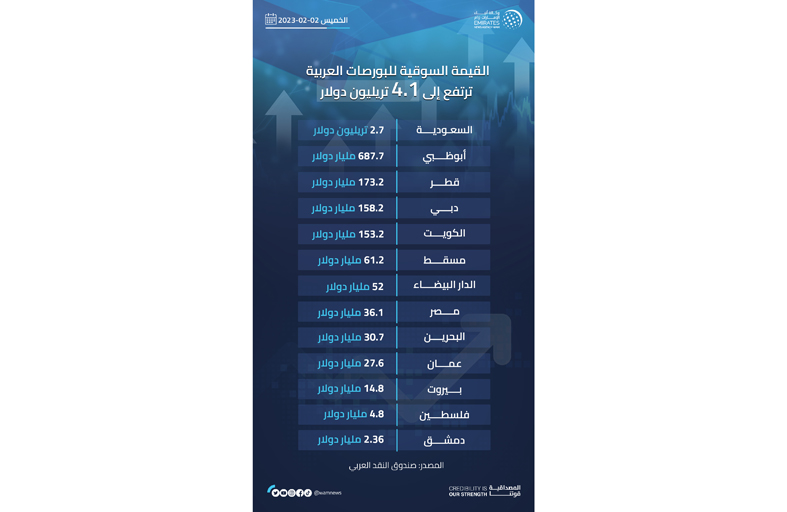 القيمة السوقية للبورصات العربية تتجاوز 4.1 تريليون دولار الأسبوع الماضي