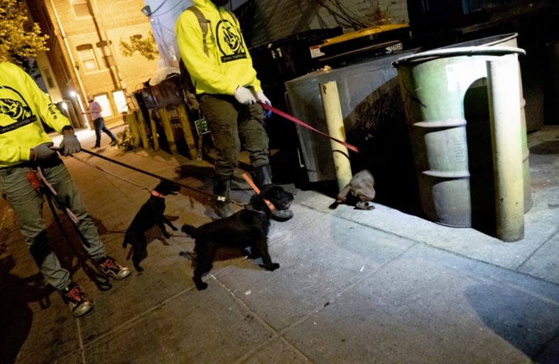 ووصلت بعثرة النفايات هذه إلى نهايتها مع تولّي عشرات الكلاب المحاطة بأصحابها مطاردة هذه القوارض في عملية تجري أسبوعياً.ويتوجه مدرب الكلاب مارشال فينبرغ (28 عاماً) لكلبه عقب اصطياده أول فريسة له في تلك الليلة بالقول "أحسنت يا هنري!".