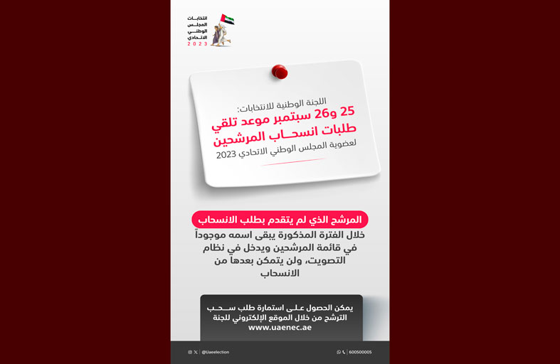 وحددت اللجنة الوطنية للانتخابات (7) أماكن لتلقي طلبات سحب الترشح، موزعة على جميع الإمارات وهي مقر لجنة إمارة أبوظبي في غرفة تجارة وصناعة أبوظبي- الطابق الثاني، ومقر لجنة إمارة دبي في قاعة حتا (C&D) بمركز دبي التجاري العالمي، ومقر لجنة إمارة الشارقة في المجلس الاستشاري لإمارة الشارقة، ومقر لجنة إمارة عجمان في قاعة الشيخ حميد بن راشد بمتحف عجمان، ومقر إمارة لجنة أم القيوين في مبنى وزارة تنمية المجتمع بأم القيوين- الطابق الأول، ومقر لجنة إمارة رأس الخيمة في الديوان الأميري – رأس الخيمة، ومقر إمارة لجنة الفجيرة في غرفة تجارة وصناعة الفجيرة- الطابق الثامن، على أن يتم تقديم طلبات سحب الترشح من الساعة (الثامنة) صباحاً إلى الساعة (الثالثة) عصراً. تجدر الإشارة إلى أن المادة (35) من التعليمات التنفيذية لانتخابات المجلس الوطني الاتحادي 2023 تلزم المرشح المنسحب بإزالة جميع مظاهر حملته الانتخابية خلال أسبوع - على الأكثر- من تاريخ انسحابه. ودعت اللجنة الوطنية للانتخابات المرشحين كافة إلى الاستثمار الأمثل للمدة المتبقية من فترة الحملات الانتخابية، والتي تنتهي في 3 أكتوبر المقبل وعرض برامجهم الانتخابية وفق القواعد والضوابط المنصوص عليها في التعليمات التنفيذية لانتخابات.