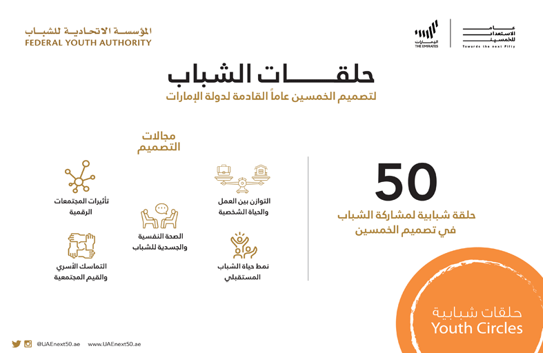 أطلقت المؤسسة الاتحادية للشباب بالشراكة مع لجنة الاستعداد للخمسين سلسلة حلقات شبابية ضمن أجندة عام الاستعداد للخمسين، في إطار جهودها لتنفيذ توجيهات صاحب السمو الشيخ محمد بن راشد آل مكتوم نائب رئيس الدولة رئيس مجلس الوزراء حاكم دبي "رعاه الله" بإشراك أفراد المجتمع في رسم مستقبل دولة الإمارات ووضع محاور ومكونات خطة مئوية الإمارات.