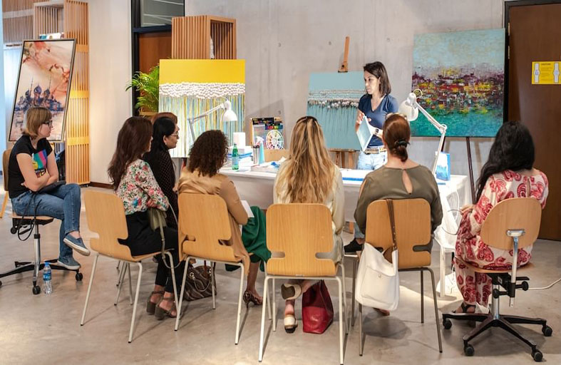 يُواصل المجمّع الثقافي تقديم مجموعة واسعة من الدورات التعليمية وورش العمل والمخيمات الموسمية والبرامج الخاصة للكبار واليافعين والشباب والصغار في استوديوهاته الفنية، بيت الخط، والمرسم الحر. تُتيح هذه المساحات لأفراد المجتمع فرصةً لتطوير وتنمية مهاراتهم الفنية في مجموعة متنوعة من المجالات، مثل الرسم، والتصويرالتشكيلي، والنحت، والفخار، وتصميم الأزياء، والخياطة، وفن الخط العربي.