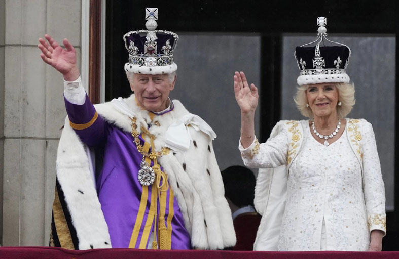 وتم تصوير تشارلز وهو يضع التاج الملكي بينما ارتدت كاميلا تاج الملكة ماري وارتدى كلاهما الزي الرسمي للتتويج.
