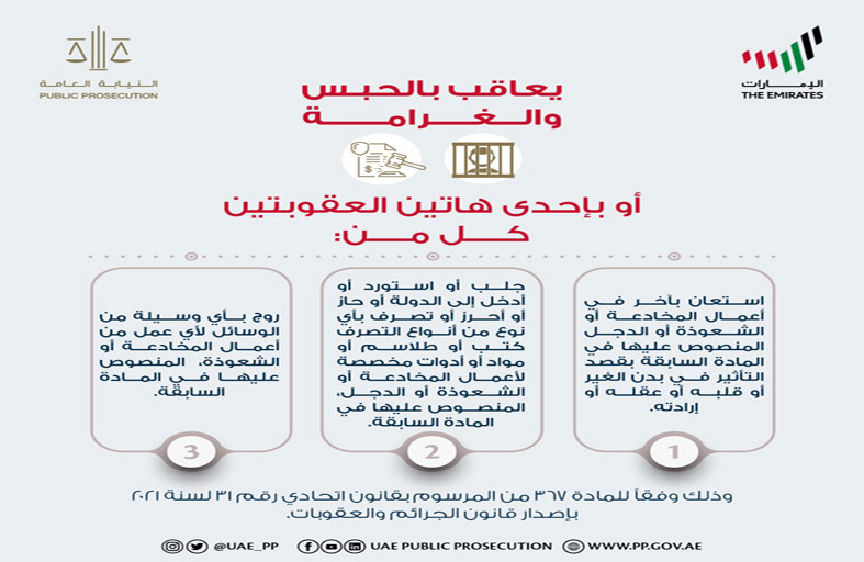 أوضحت النيابة العامة للدولة، من خلال تغريدة نشرتها أمس على حساباتها في مواقع التواصل الاجتماعي عقوبة أعمال الشعوذة. وأشارت النيابة العامة إلى أنه طبقا للمادة 366 من المرسوم بقانون اتحادي رقم 31 لسنة 2021 باصدار قانون الجرائم والعقوبات، يعاقب بالحبس والغرامة التي لا تقل عن (50,000) خمسين ألف درهم، كل من ارتكب بقصد استغلال الغير أو الإضـرار بـه، عملاً من أعمال المخادعة أو الشعوذة أو الدجل، سـواء كان ذلك حقيقة أو خداعاً، بمقابل أو بدون مقابل، ويعد من هذه الأعمال إتيان أفعال أو التلفظ بأقوال أو استخدام أساليب أو وسائل غير جائزة أو مقبولة عقلاً للتأثير في بدن الغير أو قلبه أو عقله أو إرادته مباشرة أو غير مباشرة، حقيقة أو تخيلاً ..والتمويه على أعين الناس أو السيطرة على حواسهم أو أفئدتهم بأي وسيلة لحملهم على رؤية الشيء على خلاف الحقيقة بقصد استغلالهم والتأثير في معتقداتهم أو عقولهم.