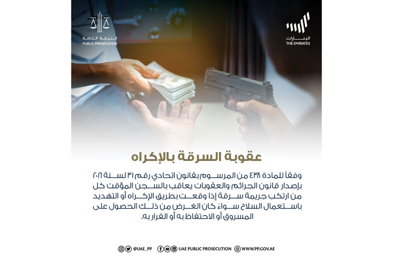 وأشارت النيابة العامة إلى أنه طبقا للمادة 438 من المرسوم بقانون اتحادي رقم 31 لسنة 2021 بإصدار قانون الجرائم والعقوبات، يعاقب بالسجن المؤقت كل من ارتكب جريمة سرقة إذا وقعت بطريق الإكراه أو التهديد باستعمال السلاح سواءً كان الغرض من ذلك الحصول على المسروق أو الاحتفاظ به أو الفرار به.