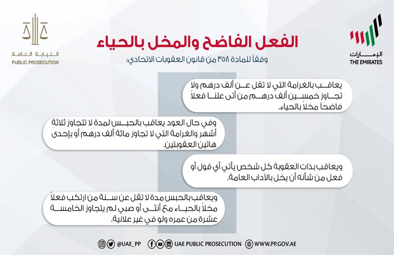 أوضحت النيابة العامة للدولة من خلال تغريدة نشرتها على حساباتها في مواقع التواصل الاجتماعي عقوبة كل من أتى علنا فعلا فاضحا مخلا بالحياء. ونوهت النيابة العامة إلى أنه طبقا للمادة 358 من قانون العقوبات الاتحادي يعاقب بالغرامة التي لا تقل عن ألف درهم ولا تجاوز خمسين ألف درهم من أتى علنا فعلا فاضحا مخلا بالحياء وفي حال العودة يعاقب بالحبس لمدة لاتتجاوز ثلاثة أشهر والغرامة التي لاتجاوز مائة ألف درهم أو بإحدى هاتين العقوبتين ويعاقب بذات العقوبة كل شخص يأتي أي قول أو فعل من شأنه أن يخل بالآداب العامة ويعاقب بالحبس مدة لا تقل عن سنة من ارتكب فعلا مخلا بالحياء مع أنثى أو صبي لم يتجاوز الخامسة عشرة من عمره ولو في غير علانية.