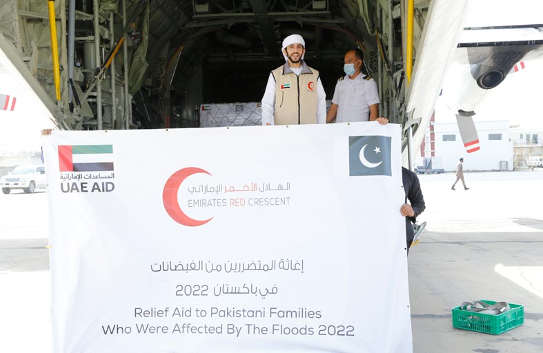 واصلت هيئة الهلال الأحمر الإماراتي، تسيير جسرها الجوي إلى باكستان لنقل المزيد من المواد الإغاثية والاحتياجات الإنسانية للمتأثرين من السيول والفيضانات، وعززت الهيئة جهودها الإنسانية للحد من التداعيات الناجمة عن الكارثة خاصة في المناطق الأكثر تضررا في إقليم السند.