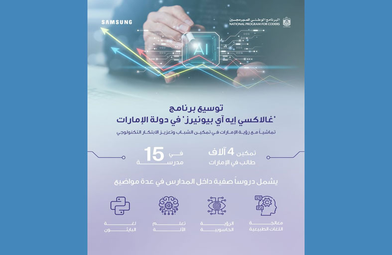 أعلن البرنامج الوطني للمبرمجين وشركة سامسونغ غلف للإلكترونيات، توسيع نطاق البرنامج التدريبي المختص بالذكاء الاصطناعي "غالاكسي إيه آي بيونيرز" ليشمل دروساً صفية في القاعات في عدد من مدارس الدولة. ويستهدف البرنامج أكثر من 4 آلاف طالب وطالبة في 15 مدرسة في أبوظبي ودبي، يقدم لهم مادة علمية خلال ساعات الدوام المدرسي في مجالات الذكاء الاصطناعي، والبرمجة، والمحتوى الإبداعي والسلامة على الإنترنت، وغيرها. ويهدف البرنامج الأحدث ضمن برامج التدريب الشبابية التي أطلقها البرنامج الوطني للمبرمجين وسامسونغ إلى تعريف الطلاب في الفئة العمرية بين 12 و17 عاماً بمنظومة الذكاء الاصطناعي من خلال مجموعة واسعة من المواضيع، تشمل أساسيات الذكاء الاصطناعي، والبرمجة باستخدام لغة بايثون، وتعلم الآلة، والتعلم العميق، والرؤية الحاسوبية، وروبوتات الذكاء الاصطناعي، ومعالجة اللغات الطبيعية.