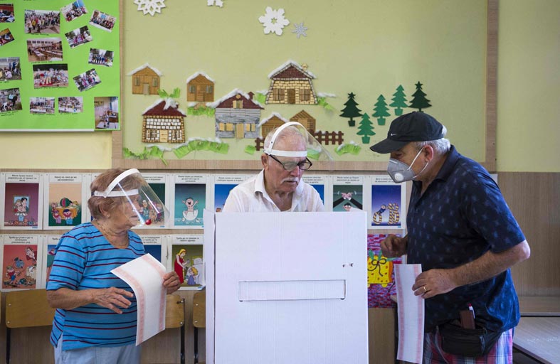 وتقيّد الناخبون بتعليمات وضع كمامات واقية إلزامية فيما كانوا ينتظرون أمام مراكز الاقتراع في سكوبيي