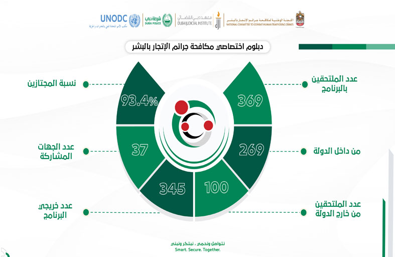 أطلقت اللجنة الوطنية لمكافحة جرائم الاتجار بالبشر والقيادة العامة لشرطة دبي بالتعاون مع معهد دبي القضائي ومكتب الأمم المتحدة المعني بالمخدرات والجريمة، فعاليات الدفعة الثامنة من برنامج دبلوم "اختصاصي مكافحة الاتجار البشر" الهادف إلى إعداد نخبة مؤهلـة في جميع الدوائر والمؤسسات المعنية، للتعامل بكفاءة ومهنية عالية مع جريمة الاتجار بالبشر ورعاية ضحايا هذه الجريمة المُنظمة العابرة للحدود.