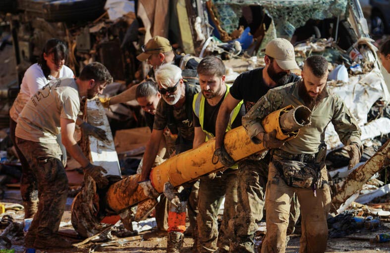 وخرج آلاف المواطنين الذين جَروا عربات تسوّق وحملوا معدات تنظيف إلى الشوارع، الجمعة، للمساعدة في التعافي. وذكرت نائب المسؤول عن فالنسيا سوزانا كاماريرو، أن بعض البلديات حصلت على كم هائل من “المواد الغذائية”. وتواصل التحرك، السبت، إذ خرج حوالي ألف شخص من مدينة فالنسيا الساحلية إلى بلدات قريبة دمّرتها الفيضانات.