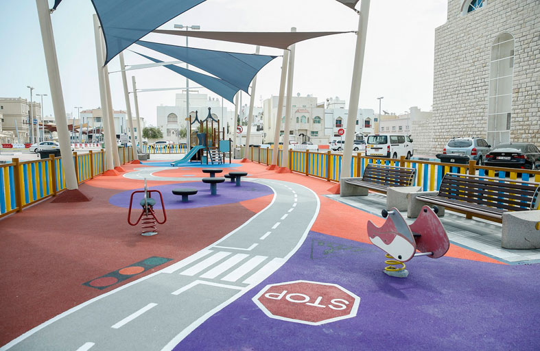 كما تتكون الطبقة السطحية من حبيبات مطاط طبيعي تستورد من خارج الدولة وتخلط مع مواد لاصقة وتصب في أرضيات مناطق الألعاب، وذلك لامتصاص الصدمات وتوفير السلامة لمستخدمي مناطق الألعاب، حيث تم صب الأرضيات المطاطية على هيئة أشكال تعليمية وترفيهية لتصبح مناطق الألعاب تفاعلية وتعليمية وترفيهية في آن واحد.