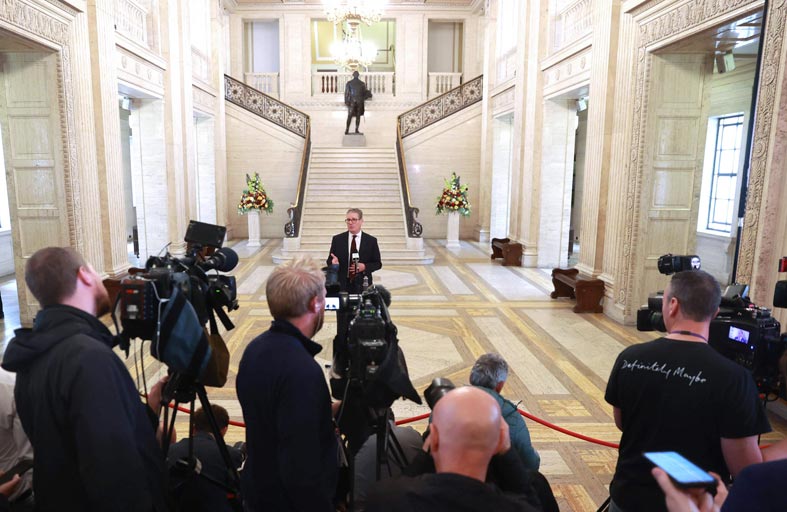ووصل ستارمر صباحًا إلى قصر ستورمونت مقرّ مؤسسات الحكم المحلي حيث اجتمع لوقت قصير برئيسة الوزراء الجمهورية ميشيل أونيل ونائبتها إيما ليتل-بينغيلي.