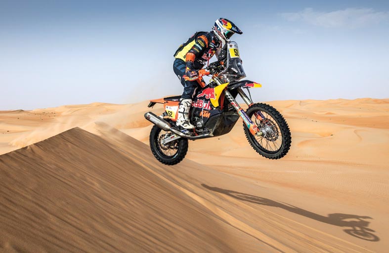 وسجل بيترهانسيل أول فوز له في الرالي على عجلتين في عام 1996، ويبدو راضياً عن إحراز ثالث أسرع زمن اليوم، فهو يعرف التضاريس تقريباً مثل الدراج سام سوندرلاند الذي عاش في الإمارات العربية المتحدة لمدة عشر سنوات ويتصدر ترتيب الدراجات.
