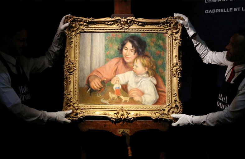 وفي لوحة "الطفل وألعابه - غابرييل ونجل الفنان، جان"، يظهر الثاني بين أبناء الفنان الخمسة جالساً في حضن مربيته غابرييل رونار، يلعب بتماثيل بشرية وحيوانية. وأوضحت نبذة عن المزاد أن اللوحة "مثال نموذجي على براعة الرسام في أوج عطائه".