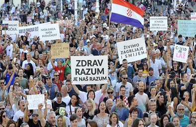 تجمّع آلاف الكروات في زغرب احتجاجاً على الإجراءات التي فرضتها السلطات لمواجهة فيروس كورونا المستجدّ، والتي يقول المتظاهرون إنّها تنتهك حرّياتهم وحقوقهم الإنسانيّة.