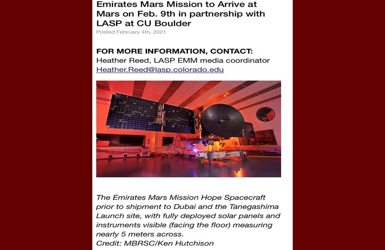 بدوره نشر الموقع الإلكتروني لجامعة ولاية أريزونا الأمريكية تقريرا مفصلا عن مشروع الإمارات لاستكشاف المريخ "مسبار الأمل"، مشيرا إلى أن مسبار الأمل، أول مشروع تقوده دولة عربية لاستكشاف الكواكب، سيصل إلى مدار المريخ يوم الثلاثاء المقبل، و سيوفر صورة شاملة غير مسبوقة للغلاف الجوي المريخي، وسيقضي المسبار سنة مريخية واحدة /حوالي عامين على الأرض/ يدور حول الكوكب الأحمر لجمع بيانات علمية مهمة.