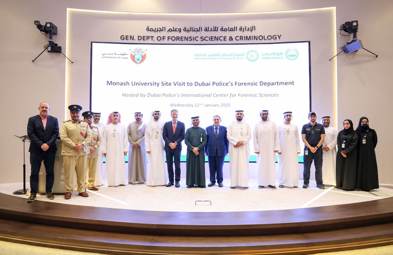اطلع وفد من جامعة موناش الأسترالية على أفضل الممارسات المتبعة في الأدلة الجنائية بالمركز الدولي للعلوم الجنائية في الإدارة العامة للأدلة الجنائية وعلم الجريمة في شرطة دبي.