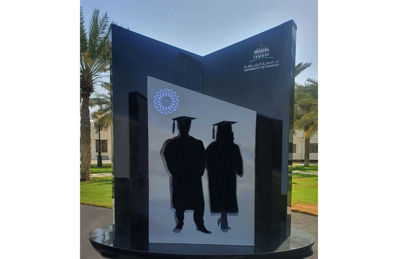 بمناسبة احتفال جامعة الشارقة باليوبيل الفضي، ومرور 25 عاماً على إنشائها، أزاحت الجامعة الستار عن النصب التذكاري الذي تم تصميمه ليكون شاهداً ومعبراً عن التميز الذي حققته الجامعة خلال مسيرتها منذ نشأتها عام 1997م، ويعبر هذا العمل عن دعم الجامعة وتخليدها لطلبتها المتميزين، وتم وضعه في مدخل المبنى الرئيسي للجامعة.