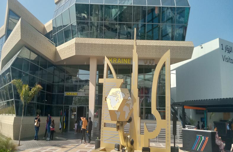 يدعو جناح أوكرانيا الزوار لاكتشاف المجالات الثلاثة من حياة والتفكير والإحساس الذكي، والاستمتاع بالعروض الترفيهية التى تضم الأزياء والندوات الموضوعية وعروض فنية، وأداء إبداعي للتنمية المستدامة والداعمة لمسقبل ينهض بمجتمع جديد يقدر الإبتكار في مجال والتنقل، كما يبرز الجناح لزواره مكانة القطاع التكنولوجي المزدهر الذي يدعم في الاساس الحفاظ على الإرث الثقافي والتراث العريق، فلقد ضم الجناح عدد كبير من الإبتكارات مثل الدراجة الإلكترونية التى بستطيع أن تسير مسافة تقل قليلا عن أربعمائة كيلو متراً في الشحنة الواحدة، هذه الملاحظة يكتشفها الزائر بمجرد دخوله الجناح والتجول في أرجائه، حيث تبدأ الجولة بالطابق الأول الذي يضم حقل من سنبلات حقيقية من القمح انشات خصيصاً في مواجهة الجمهور عند الدخول، وبجوارها طواحين الهواء للاستفادة من الرياح في توليد الطاقة المتجددة، وقد اشتهرت أوكرانيا بزراعة القمح وتصديره لدول العالم ، مما يدل على خصوبة التربة لإنتاج المحاصيل الزراعية والتى تشكل أهمها القمح، وبجوار الحقل يقف جرار زراعي متعدد الاستخدامات حيث يدخل في جميع أعمال التجهيزات الأولية للزارعة، فهو الذي يستخدم في الحرث والحصاد والتنقل بواسطة اضافة الألات المتنوعة للاستخدام.