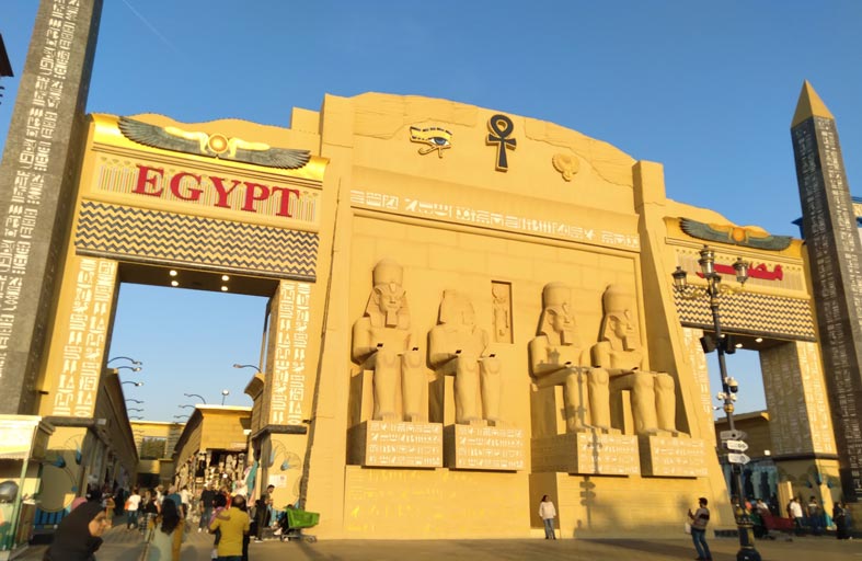 مصر التي تكرس دائما كل جهدها على إن يكون لها جناحا مميزا في القرية العالمية منذ نشأتها وبداياتها وفي كل موسم.. ومنذ البداية وهي حريصة على إن يكون تصميم جناحها سواء من الخارج أو من الداخل معبرا عن حضارة مصر الفرعونية والإسلامية لان مصر دائما محط أنظار العالم العربي بل العالم كله.. والكل مهتم بتاريخ مصر وحضارات مصر لماذا ؟.. لان مصر هي الرائدة لكل العرب ومفتاح أمنهم.. وكلهم حريصين على أن تكون بخير واذا ألم بها مكروه أو تعرضت لأي اعتداء يتكاتفوا جميعا معها والتاريخ شاهد على ذلك.. وفي القرية العالمية تجد دائما الضيوف من كل الجنسيات حريصون على زيارة جناح مصر لذي تبلغ مسحته 3500 مترا مربعا ويضم 64 محلا  للتعرف على حضاراتها وتاريخها من خلال تصميم الجناح ومن خلال الفعاليات التاريخية الشيقة التي يقدمها لهم الجناح, وللتعرف على منتجاتها وصناعاتها وبضائعها المختلفة والمميزة والمشهورة عالميا المعروضة داخل محلات الجناح,