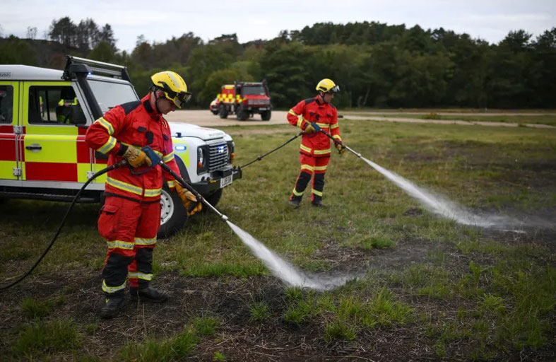 في مركز لتدريب الجيش في ساري، في جنوب شرق إنكلترا، يتدرب فريق من عناصر الإطفاء على مواجهة عدو جديد: احترار المناخ الذي يزيد من خطر اندلاع حرائق الغابات.