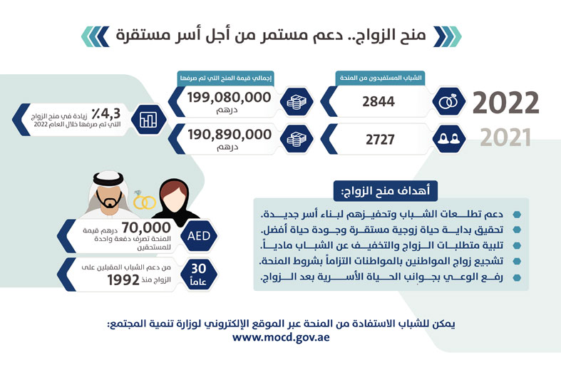 كشفت معالي حصة بنت عيسى بوحميد، وزيرة تنمية المجتمع، أن إجمالي المبالغ التي تم صرفها كمنح مالية للزواج خلال العام الماضي 2022، بلغ 199,080,000 درهم إماراتي، شملت 2,844 مستفيداً على مستوى إمارات الدولة، مقارنة بــ 2,727 مستفيداً من المنحة خلال العام 2021.