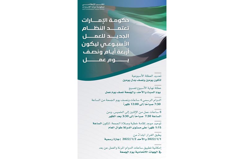 حكومة الإمارات النظام الجديد للعمل الأسبوعي للقطاع الحكومي الاتحادي بالدولة، لتكون أربعة أيام ونصف يوم عمل وذلك من يوم الاثنين إلى الخميس، ونصف يوم عمل في يوم الجمعة، وتكون العطلة الأسبوعية يومي السبت والأحد، وذلك ابتداءً من تاريخ 1 يناير 2022، على أن يكون الأحد 2 يناير إجازة رسمية.
