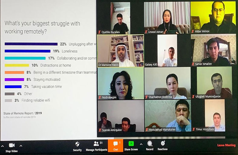 نظمت حكومة دولة الإمارات برامج تدريبية افتراضية لبناء قدرات موظفي الجهات الحكومية في أوزبكستان للعمل عن بعد، بالاستفادة من تجربة الدولة في “العمل عن بعد”، وضمان استمرارية تأدية الأعمال وتقديم كافة الخدمات الحكومية بكفاءة عالية في الظروف الاستثنائية الطارئة نتيجة تفشي فيروس كورونا المستجد (كوفيد-19)، وما يتطلبه ذلك من إجراءات وقائية.
