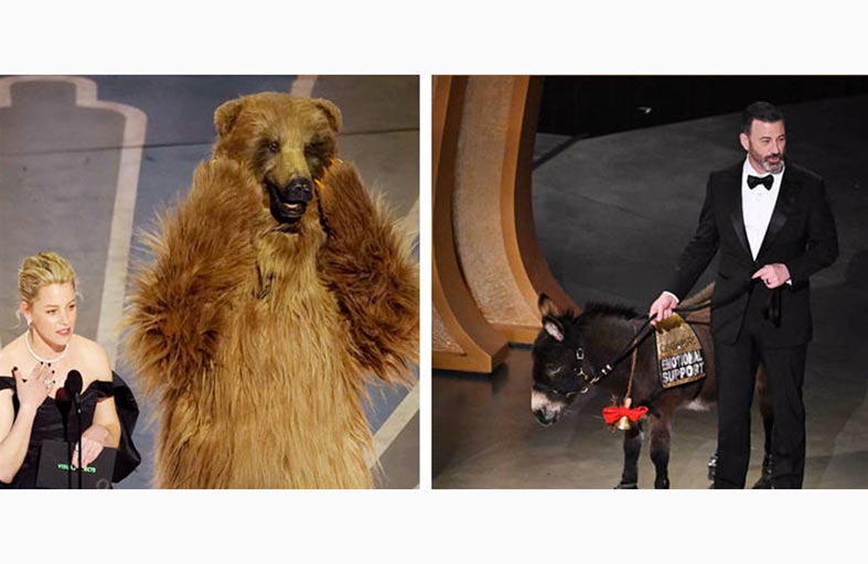 حمار على خشبة المسرح: أدخل كيمل حمارا إلى خشبة المسرح، وقد أشار إلى أن هذا الحمار الذي يدعى جيني، هو الذي شارك في فيلم The Banshees of Inisherin. دب على المسرح: قدمت النجمة إليزابيث بانكس جائزة الأوسكار لأفضل تأثيرات بصرية، مرفوقة بشخص يرتدي زي دب ضخم، في إشارة منها إلى الدب الذي ظهر في فيلم «Cocaine Bear»، الذي أخرجته مؤخرا. إشادة جون ترافولتا: عند تقديمه تكريما لشخصيات هوليوود الذين لقوا حتفهم العام الماضي، قدم جون ترافولتا إشادة عاطفية لنجمة «Grease»، أوليفيا نيوتن جون. وفي هذا الصدد قال: “نظل مخلصين لك بشكل ميؤوس منه”، في إشارة إلى أغنيتها الشهيرة. الصفعة: احتفى المذيع الساخر جيمي كيمل الذي قدم حفل توزيع جوائز الأوسكار لثالث مرة يوم أمس الأول الاثنين بعودة الجمهور إلى دور السينما بعد جائحة كوفيد-19.
