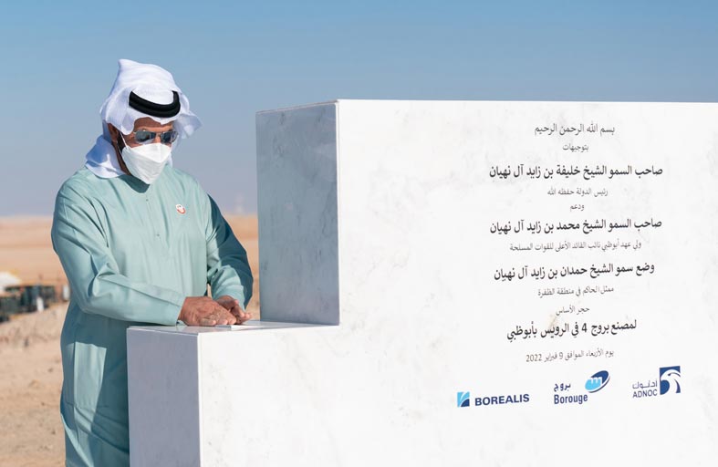 جاء ذلك خلال قيام سموه بوضع حجر الأساس لمنشأة بروج التوسعية الرابعة "بروج 4 " في مجمع الشركة لإنتاج البولي أوليفينات في الرويس بأبوظبي والذي تبلغ تكلفته 22 مليار درهم 6.2 مليار دولار أمريكي.