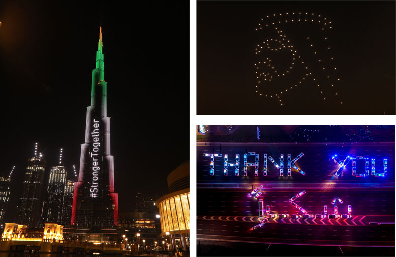 الفيديو، الذي أعدته "براند دبي" الذراع الإبداعية للمكتب الإعلامي لحكومة دبي، بالشراكة مع "دن إيفينتس" من المجموعة الإعلامية العربية، وشركة "أي.او درونز"، بالتعاون مع القيادة العامة لشرطة دبي، والإدارة العامة للدفاع المدني، ومؤسسة دبي لخدمات الإسعاف، وهيئة الطرق والمواصلات، وبلدية دبي، وهيئة دبي للطيران، وهيئة الصحة بدبي، ولجنة دبي للإنتاج السينمائي، يوثّق من خلال الصورة رسائل شكر نفذت بمشاركة 120 طائرة من طائرات الدرونز المُسيّرة عن بُعد لتشكيل لوحات من نور أضاءت سماء دبي جاء في مقدمتها صورة صاحب السمو الشيخ محمد بن راشد آل مكتوم، وعلامة النصر الثلاثية الشهيرة لسموه، والعديد من الصور الرمزية للتدابير الوقائية الأساسية التي يجب على جميع أفراد المجتمع الحفاظ على تطبيقها.