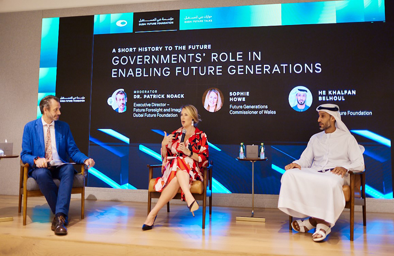نظمت مؤسسة دبي للمستقبل جلسة حوارية خاصة بعنوان "دور الحكومات في تمكين أجيال المستقبل" ضمن "حوارات دبي للمستقبل"، استضافت صوفي هاو مفوض أجيال المستقبل في ويلز، وسعادة خلفان جمعة بلهول الرئيس التنفيذي لمؤسسة دبي للمستقبل. وهدفت الجلسة التي أدارها باتريك نواك المدير التنفيذي لقطاع الاستشراف وتخيل المستقبل في مؤسسة دبي للمستقبل، إلى تبادل الخبرات واستعراض أبرز المبادرات والخطط والاستراتيجيات الحكومية الهادفة إلى توفير مستقبل أفضل للأجيال الحالية والمستقبلية على المستوي المحلي والعالمي.