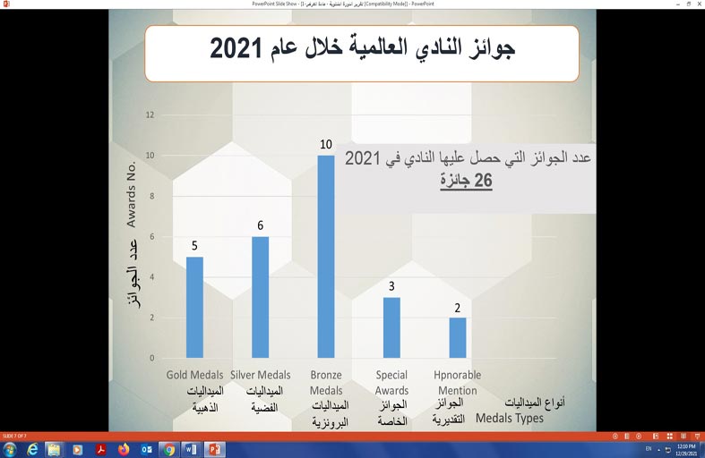 وجدير بالذكر أن النادي العلمي حصد خلال عام 2021 26 جائزة محلية وإقليمية وعربية ودولية منها 6 جوائز في المسابقة الافتراضية للابتكار والتصميم بتركيا، و3 جوائز في الملتقى العربي السابع للطلائع بمصر، و7 جوائز في المسابقة الدولية الافتراضية للعلوم التي نظمتها انتوك جلوبال التركية، و3 جوائز في مسابقة العويس للإبداع، وجائزة في المسابقة العالمية للعلوم والتكنولوجيا في هونج كونج، وجائزة في المسابقة الافتراضية للاختراعات والابتكارات بإندونيسيا و5 جوائز في المعرض الافتراضي للهندسة والعلوم والفنون بتركيا.
