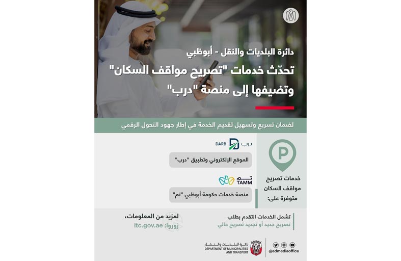 أعلنت دائرة البلديات والنقل متمثلة بمركز النقل المتكامل، عن تطوير خدمة طلب تصريح مواقف السكان في إمارة أبوظبي، بهدف توفير الوقت على المتعاملين، حيث سيتم توفير خدمة تصاريح مواقف السكان على الموقع الإلكتروني لمنصة درب https://darb.itc.gov.ae وتطبيق درب الذكي.