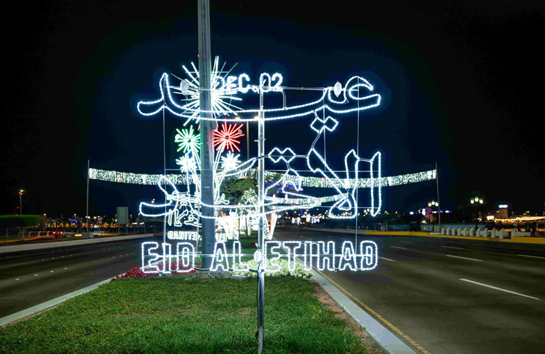 وتم تركيب زينة عيد الاتحاد في العديد من الشوارع الرئيسية، والمناطق الأكثر حيوية وإقبالاً من الجمهور، وعدد من الدوارات والجسور داخل وخارج جزيرة أبوظبي، يتصدرها شارع كورنيش أبوظبي، الذي يشهد توافداً كبيراً من أفراد المجتمع للتعبير عن احتفالهم بهذا اليوم، بجانب العديد من المناطق بالمدن الخارجية، والطرق السريعة مثل شارع الخليج العربي، شارع الشيخ زايد، شارع الملك عبدالله، وغيرها. وتشكل المجسمات المضيئة لوحات فنية متكاملة، ذات ألوان متنوعة ومتناغمة، تجسد المعاني الوطنية النبيلة، وقيم وروح الاتحاد، وتعبر عن اعتزاز وابتهاج أبناء الإمارات والمقيمين على أرضها بعيد الاتحاد.