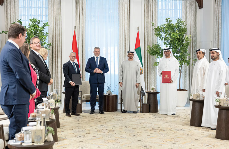شهد صاحب السمو الشيخ محمد بن زايد آل نهيان رئيس الدولة "حفظه الله" ومعالي كارل نيهامر مستشار جمهورية النمسا .. تبادل اتفاقية شراكة استراتيجية للتعاون في مجال أمن الطاقة والنمو الصناعي بين البلدين الصديقين.  وقال صاحب السمو الشيخ محمد بن زايد آل نهيان بهذه المناسبة.. إن الشراكة الإستراتيجية للتعاون في مجال أمن الطاقة والنمو الصناعي بين دولة الإمارات وجمهورية النمسا تجسد الإرادة المشتركة للبلدين الصديقين لتوطيد العلاقات الثنائية.. مشيراً سموه إلى أن هذه الشراكة توفر فرصاً جديدة لتمكين النمو الاقتصادي والصناعي منخفض الانبعاثات وتسهم في تعزيز أمن الطاقة وتدعم جهود تنفيذ العمل المناخي الفاعل.