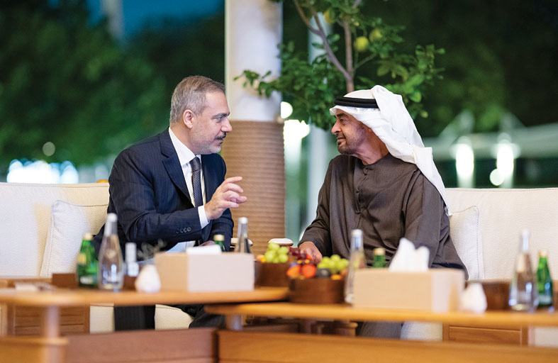 بحث صاحب السمو الشيخ محمد بن زايد آل نهيان، رئيس الدولة، حفظه الله، ومعالي هاكان فيدان، وزير خارجية الجمهورية التركية، تعزيز التعاون والعمل المشترك بين دولة الإمارات وتركيا في المجالات المختلفة في إطار العلاقات الإستراتيجية التي تجمع البلدين.
