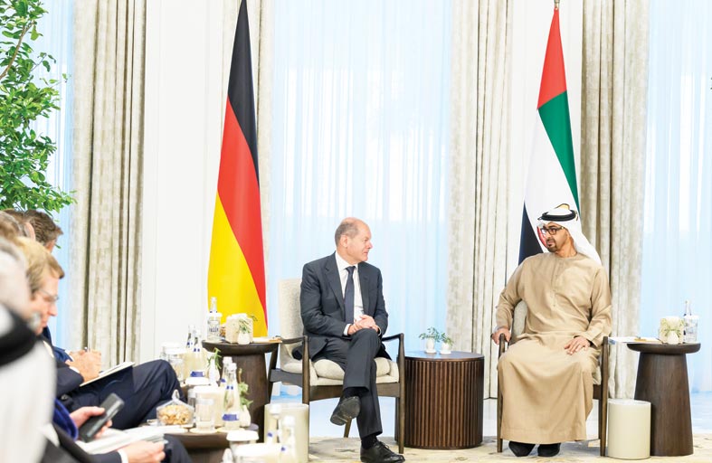 استقبل صاحب السمو الشيخ محمد بن زايد آل نهيان رئيس الدولة "حفظه الله" أمس معالي أولاف شولتس مستشار جمهورية ألمانيا الاتحادية الذي يقوم بزيارة عمل إلى الدولة.